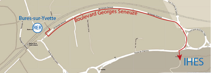 Take the RER B towards Saint-Rémy-les-Chevreuse. Get off the train at the Bures-sur-Yvette station. Follow the Seneuze boulevard that is right next to the railway. At around 500 m from the station, take the first street on your right at the "Rond-point du 8 mai 1945" roundabout. The entrance to IHÉS is on your left: N° 35 route de Chartres, almost on the roundabout (big green gate).