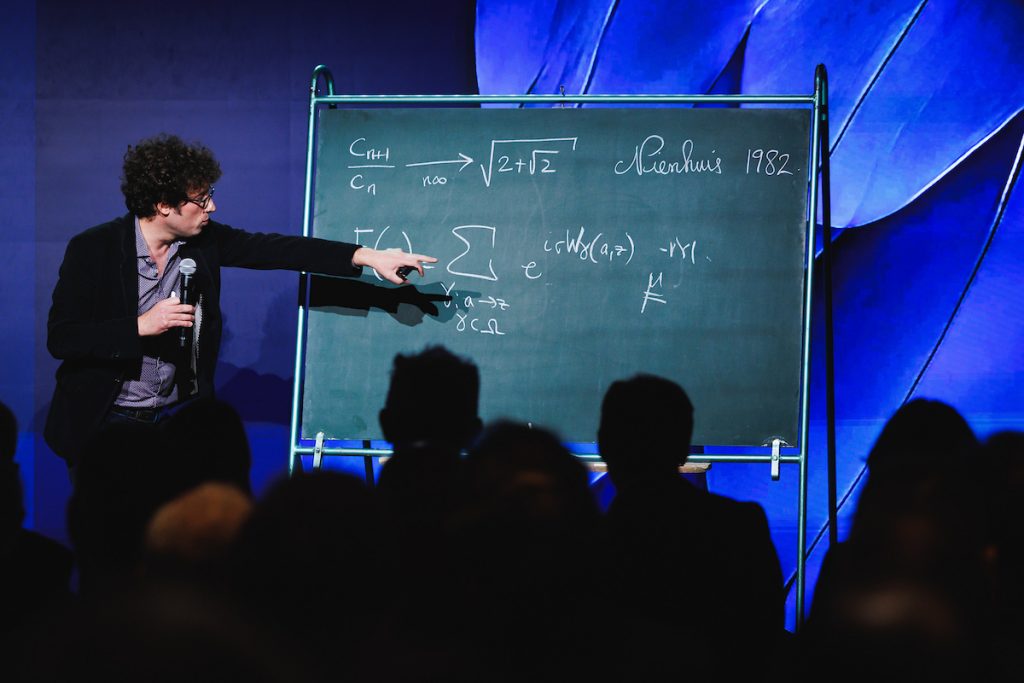 La soirée a débuté par le mot d’accueil de Thomas Buberl, directeur général d’AXA, et de Nathalie Ayi, mathématicienne et maîtresse de cérémonie. Hugo Duminil-Copin, professeur permanent à l’IHES et professeur à l’Université de Genève, lauréat de la médaille Fields 2022 a proposé un exposé intitulé « Logique ou analogique : l’équation derrière la créativité mathématique ».