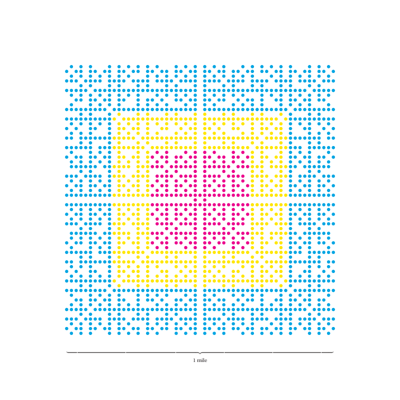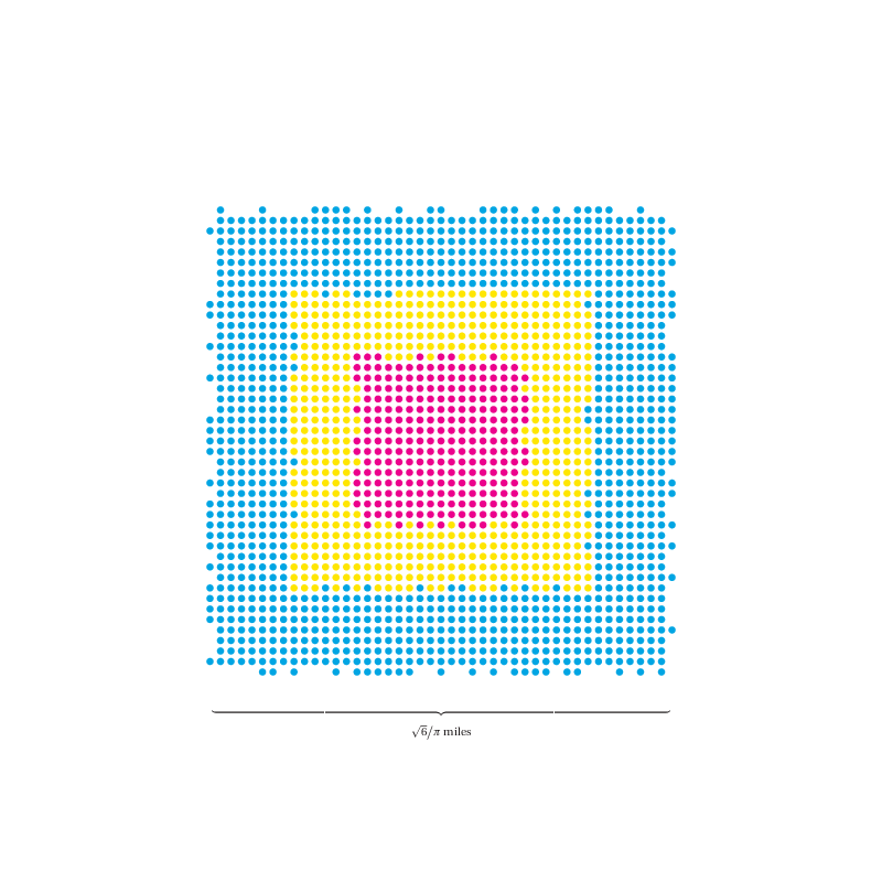 In this garden, seeds were planted in a neat grid, but not all of them grew into flowers. Each seed cast a shadow in a straight line out from the center of the garden, and the seeds planted in the shadows did not sprout.
