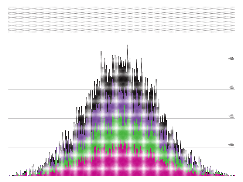 This pile was made by dropping twelve thousand balls through a giant pachinko machine, with six thousand layers of pins. Its height reflects, as expected, the number of balls and the number of pins, but it also contains a factor of π. I do not know why π took a hand in this game, which should have been ruled only by the laws of chance. Perhaps it was attracted by the thought that, in a three-dimensional pachinko machine, the balls would have fallen in a circular pile?