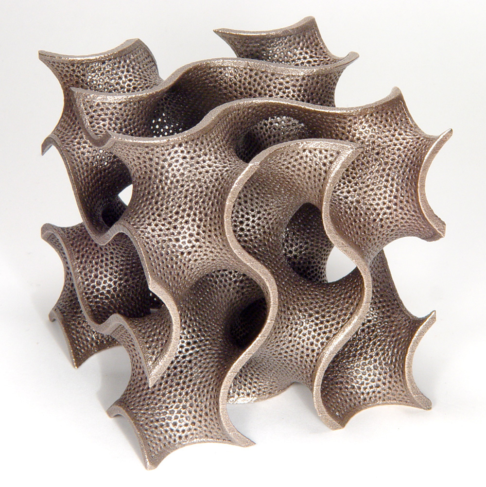 Triply periodic solids and surfaces have become a staple of mathematical sculpture. Bathsheba Grossman’s iconic gyroid sculpture is one of my favorite examples.
